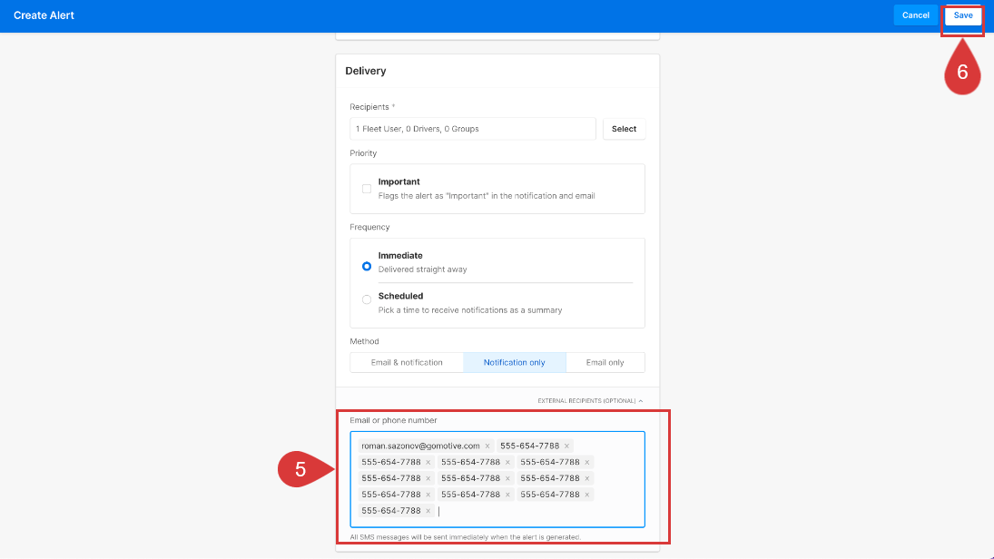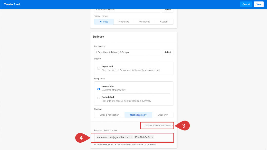 Fleet Admins can create and manage email/SMS alerts and notifications for both Fleet Managers and external recipients through Motive Fleet Dashboard.
